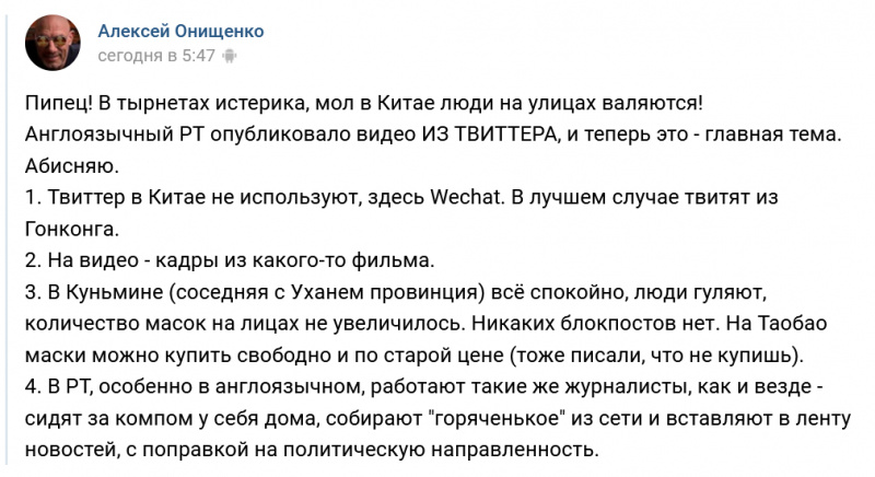 При этом в интернете уже боятся принимать посылки из Китая — мол, приедет не только чехольчик с AliExpress, но и смертельная болезнь в придачу. Эксперты утверждают, что здесь опасности нет — вирус так не передаётся. «При получении посылки не происходит заражение. Это респираторная инфекция. Заражение происходит при непосредственном контакте. С продуктами питания посложнее. Смотря какие продукты. В принципе ничего не должно быть», — уточнил эпидемиолог Олег Юрин. Так что можете смело заказывать с «алика» смартфоны, зарядки и прочие гаджеты. А вот от пакета хлопьев пока воздержитесь. (Отсюда.)