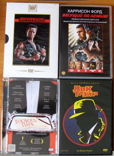 Недавно зашел в один фирменный магазинчик аудио-видео и вдруг с удивлением обнаружил там лицензионные диски, которые искал уже давно. Во-первых, "Госфорд Парк" с оригинальной дорожкой и субтитрами (англ. и рус.) - давно хотел посмотреть в оригинале. Во-вторых, "Коммандо" с оригинальной дорожкой и русскими. В-третьих, режиссерскую версию (112 минут) Blade runner с оригинальной дорожкой (правда, 2.0, но это переживаемо) и русскими-английскими субтитрами. Ну и "Дик Трэйси" с оригинальной дорожкой 5.1 и кучей самых разнообразных субтитров.