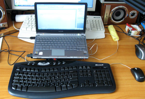 Подключил к ноутбуку, погонял - самое оно. Клава тонкая, легкая, ход у клавиш приличный, изогнутость чуть меньше, чем нужно, но терпимо. И все равно нравится больше, чем Ergonomic 4000. Вот так это выглядит в комплексе: