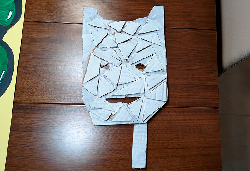 Юный Каталан для какого-то школьного проекта сделал маску. Говорит, что сам придумал ее так оформить. Забавно, у него прям получился Клетчатый, хотя этот фильм он не смотрел.