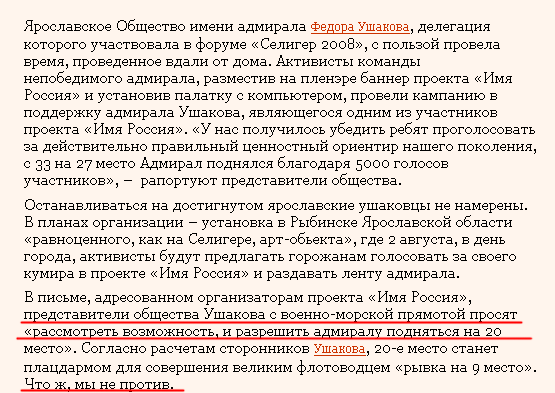 Эти клоуны из проекта "Имя Россия" продолжают веселить публику. Александр Ланге прислал ссылочку на потрясающую новость с сайта этого проекта, за что ему большое спасибо. Читаем. Рыдаем.