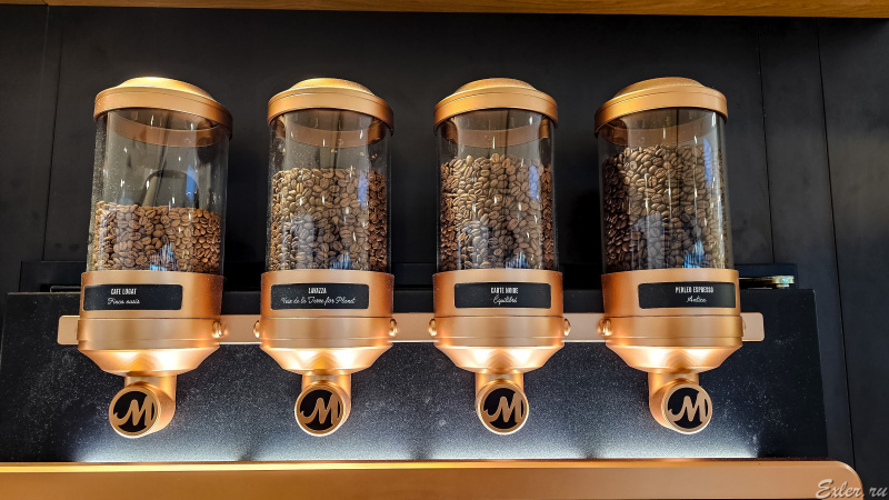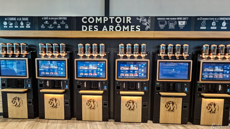 В прошлый приезд я на это не обращал внимание, а в этот раз заметил, что во всех больших заведениях при заправках на трассе есть вот такие очень продвинутые кофемашины с четырьмя сортами кофе в зернах, и там огромный выбор вариантов напитков: всевозможные виды кофе с добавками и без них, при этом можно выбрать размер порции и настроить некоторые параметры (например, крепость и насыщенность). Стоит как чашка кофе из промышленной кофемашины в баре, но качеством ничем не отличается вообще - кофе просто отличный! Так что теперь с кофе на трассах во Франции - без проблем: и быстро, потому что самообслуживание, и очень качественно.