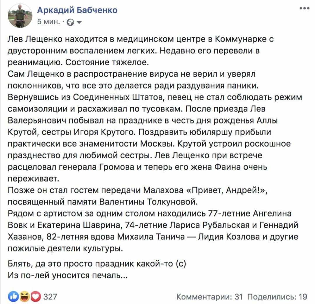 Что меня на самом деле удивляет, так это (если описанное Алексом правда, поди знай, какую херню сейчас в СМИ всех стран публикуют, а Малахова я, пардон, не смотрю) то, что он мудак; второе удивительное - у Лещенко не хватает связей, чтобы попасть в хорошую больницу? Тогда, дорогие мои, это и правда пи-ец. Сколько там официально инфецированных-то в России. Угу. Верю. Каждому зверю. Только Путину, Шойгу и ежу погожу.
