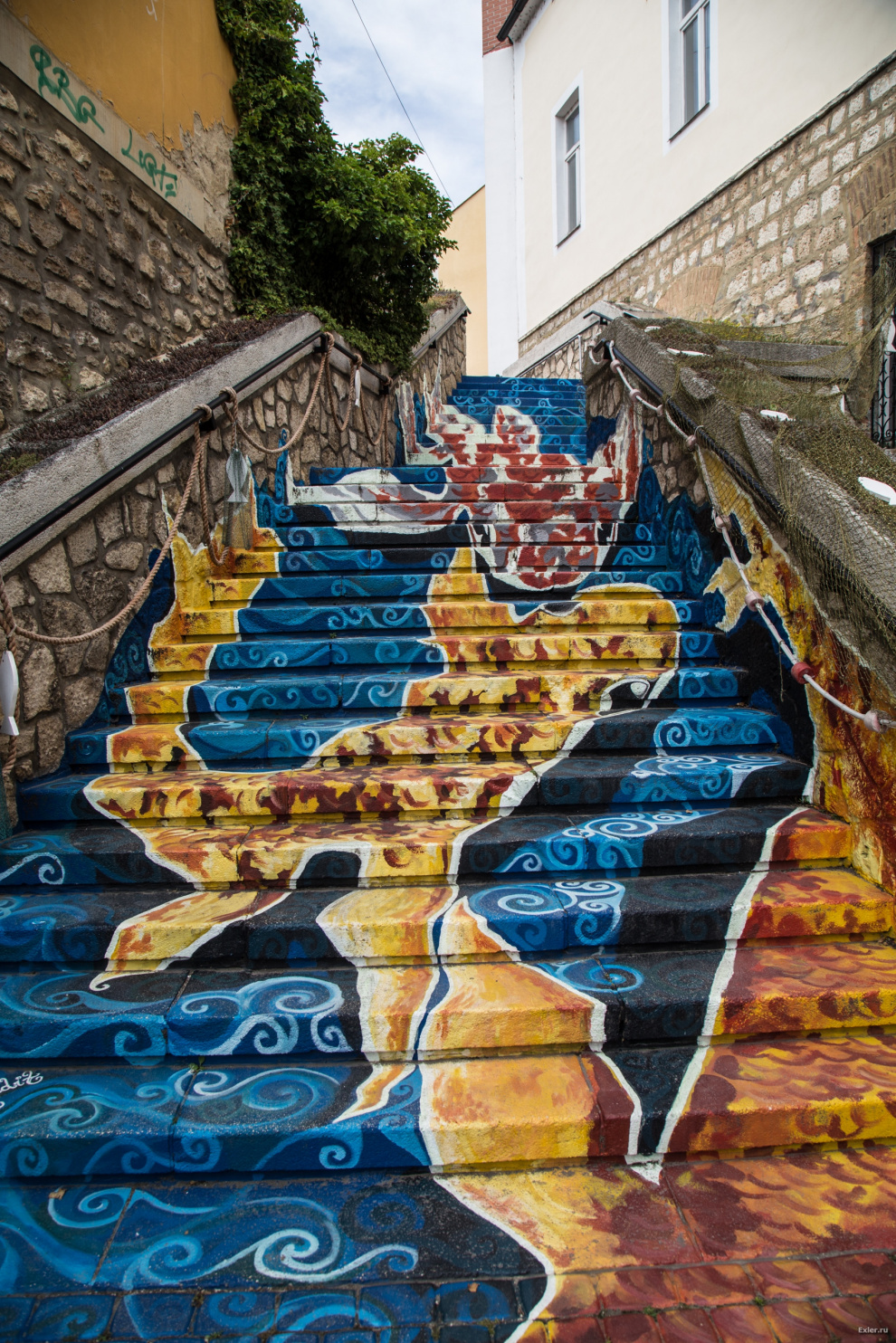 К озеру ведет красиво раскрашенная лестница, которая сразу настраивает на нужный лад.