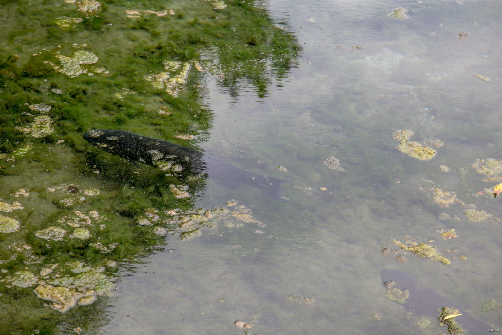 В воде плавают вот такие увесистые рыбешки. Но по поводу их породы есть разночтения. Гиды утверждают, что это гигантские толстолобики. Местные утверждают, что это черный Амур. Как по мне - это просто большие черные рыбины.