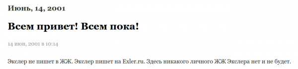 В моем ЖЖ написано, что журнал создан 14 июня 2001 года, что правда, однако там долгое время висела вот такая фраза: я тогда считал, что мне с моим Exler.ru никакой ЖЖ ни на фиг не сдался, и создал его под этим именем только для того, чтобы это не сделал какой-нибудь ушлепан.