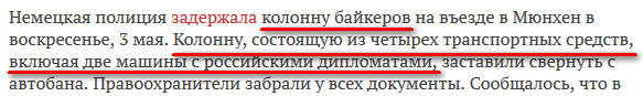 То есть я правильно понимаю, что "колонна байкеров "Ночные волки"" состояла из одного мотоцикла с гражданином Австрии, пары автомобилей с дипломатами и еще одного неустановленного транспортного средства - не знаю, может быть, самоката?