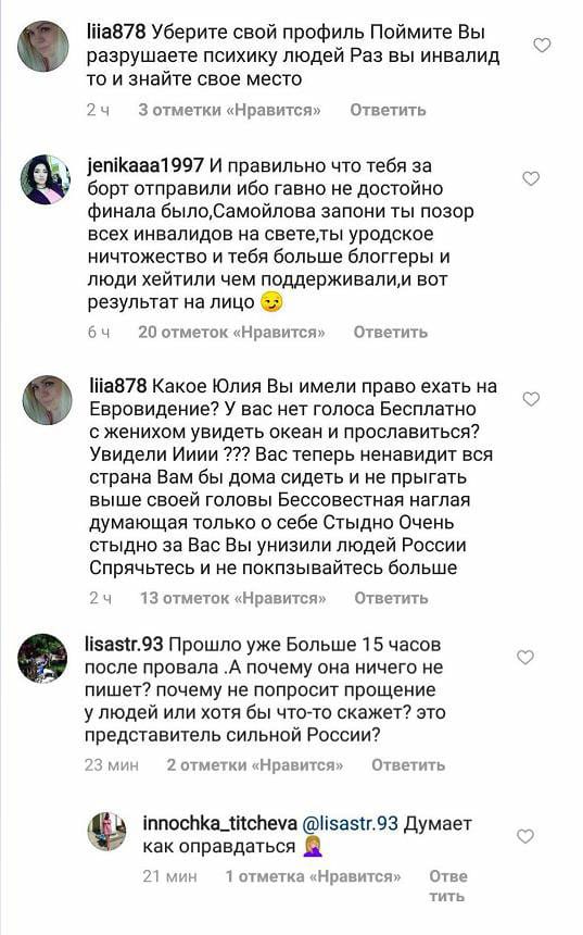 "Чморить" инвалидов,конечно, не дело, но, имхо - со стороны Украины она комменты заслужила тем, что приперлась на Евровидение во главе "Бессмертного полка" с флагами ДНР/ЛНР. А с учетом того, что поет она, как минимум, посредственно - она явно была выставлена в качестве украшения коляски, которая, собственно, и была претендентом на победу.Не думаю, что у нее не было возможности отказаться ехать, но даже если и не было - можно было хоть не использовать выезд на парад в качестве пропаганды. Так что - нет, не жаль. (Хоть своих комментов туда и не добавлю, конечно).