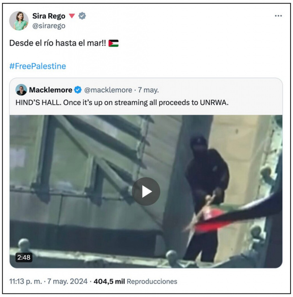 Коммунисты Испании - за ХАМАС и за уничтожение Израиля. Вот это - хамасовский лозунг "От реки до моря" - у себя в Твиттере опубликовала коммунистка Сира Рего, который, между прочим, министр по делам молодежи правительства Педро Санчеса.