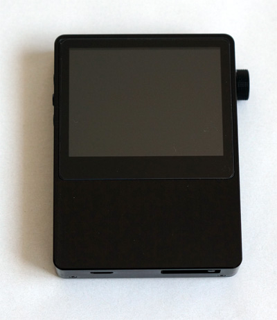 Выглядит плеер вот так. По виду слегка напоминает классический iPod, однако не имеет характерного управляющего колеса на передней части. Вместо этого - заметное механическое колесико регулировки звука справа, три небольших кнопки "вверх, вниз, играть/пауза" на левом торце и кнопка включения справа сверху. Остальное управление осуществляется с помощью сенсорного дисплея. Размер 59,2х79х14,4 мм.