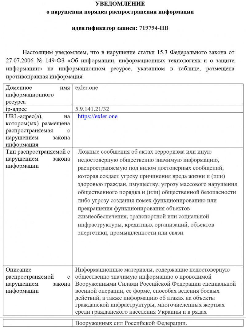 Прокуратура и Роскомговно продолжают поиски опасных преступников, которые распространяют недостоверную общественно значимую информацию о проводимой специальной миротворческой операции по деэлектрификации Украины. На этот раз обнаружили домен https://exler.one, о котором мы еще и не объявляли. Ну, хорошо, уберу его автопродление, у нас этих доменов - как грязи: там в прошлом году распродажа была, я по евро штука купил их штук двадцать.