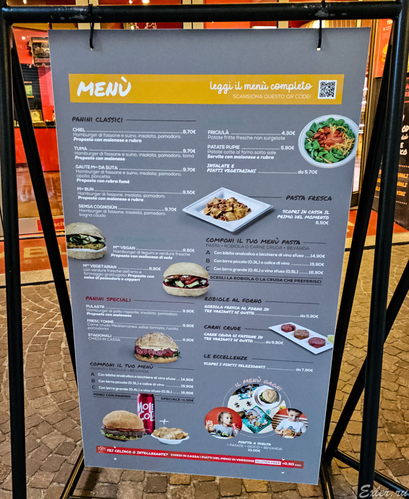В меню ресторана - бургеры из высококачественных продуктов местных производителей: например, для приготовления котлеток-бургеров используется мясо местных коров породы Fassona; также в меню традиционные туринские тартары, салаты, паста и так далее, и это все - из экологически чистой продукции.