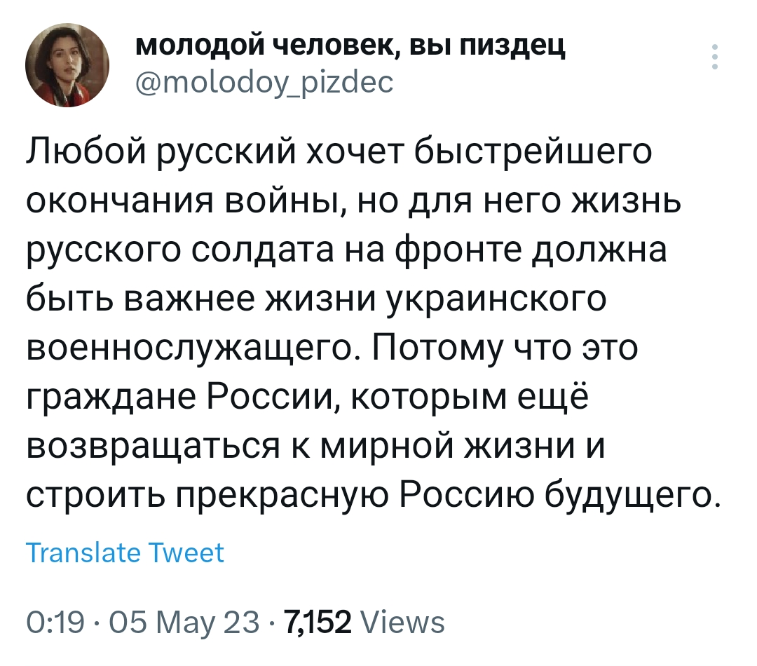 Но больше задело другое. Значит, например, удмурта, который, протрезвев после выходных, услышал по телеку, что "триста тыщ плотют" и пошёл воевать, его "бросают на убой". Его жалко.