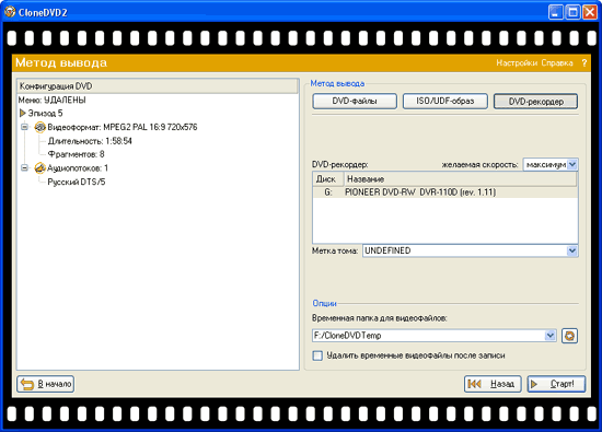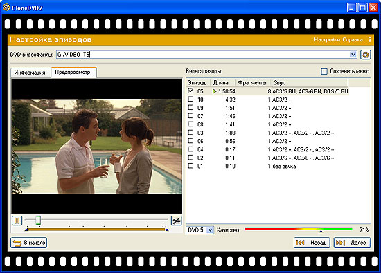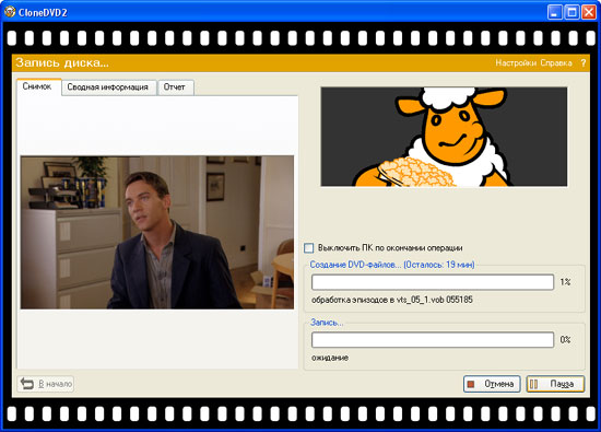 Попробовал по совету другую программку - CloneDVD2 (это разработка фирмы Elby.ch, но продается она сейчас под эгидой SlySoft, которая продает также весьма популярную программу AnyDVD). CloneDVD2 понравилась значительно больше 1Click Copy DVD - и с точки зрения наглядности, и с точки зрения результата. Вот как это все выглядит.