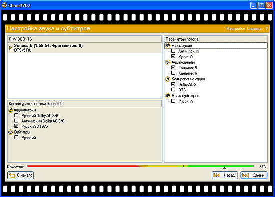 Далее идет простой, очень удобный и наглядный выбор аудиопотоков и субтитров (индикатор снизу показывает скорректированный уровень сжатия):