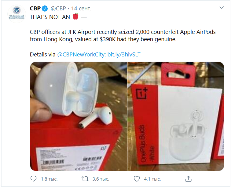 Заметка - "CBP at JFK Seizes Counterfeit Apple Airpod Earbuds".