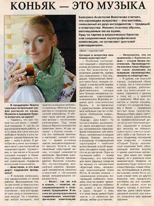 В "Профиле" статья "Коньяк - это музыка", где самая тяжелая балерина современности рассказывает о том, как хорошо бухнуть коньячку. (Тут я с ней полностью согласен.) Ну и заодно делится творческими планами. (А вот тут не согласен.) Вот кусочек: