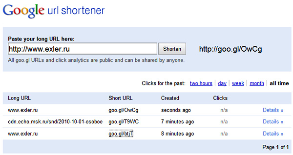 Google сделал полезный сервис - http://goo.gl. Идея очень простая. Вводите там какой-нибудь ULR (не только сайты, но и, например, URL'ы файлов или адреса карт Google), и вам выдают для него ссылку на goo.gl, состоящую из четырех символов - например, goo.gl/btjT (это www.exler.ru). Еще удобнее преобразовывать длинные урлы - например http://cdn.echo.msk.ru/snd/2010-10-01-osoboe-1908.mp3 преобразовывается в goo.gl/T9WC .