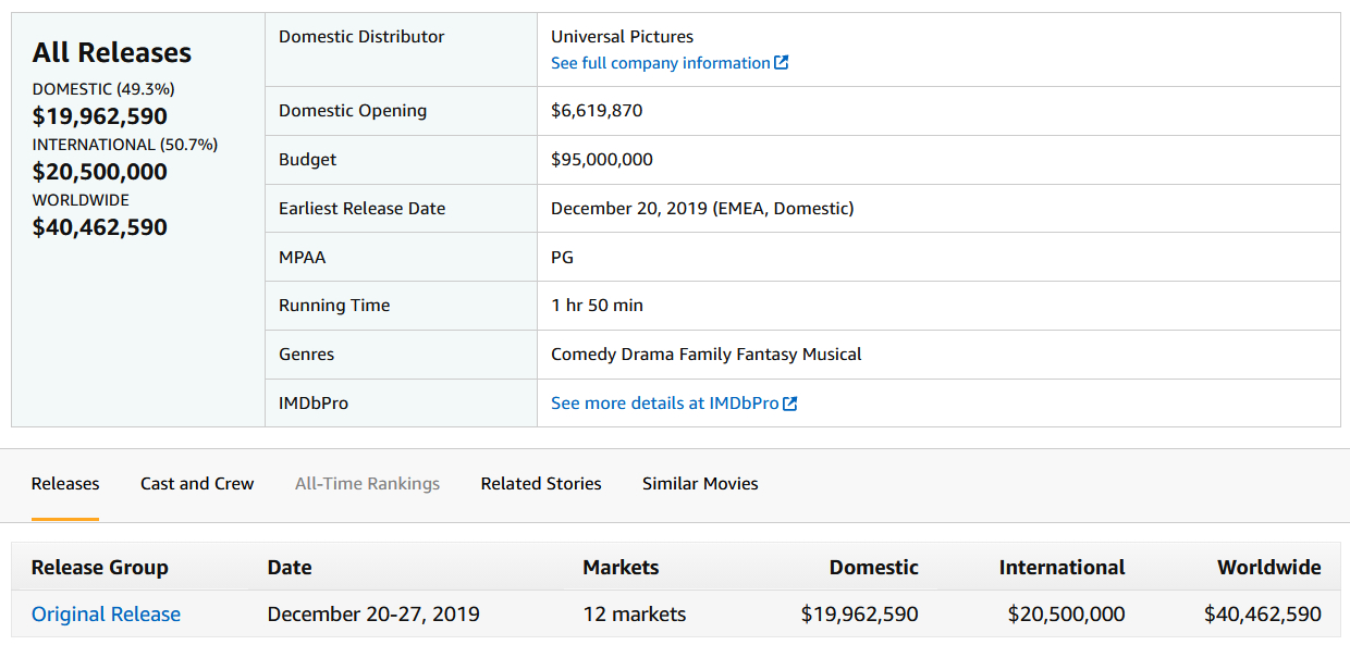 Мюзикл Cats, похоже, в прокате проваливается с совершенно сокрушительным треском. На экранах идет уже практически две недели, домашние сборы в первый уикэнд - всего $6 миллионов, на данный момент собрали $40 миллионов по миру. Очень похоже, что даже до сотни миллионов никак не дотянут. При этом бюджет - $95 миллионов и примерно столько же потрачено на маркетинг и продвижение. То есть под $200 миллионов. Провал совершенно сокрушительный.