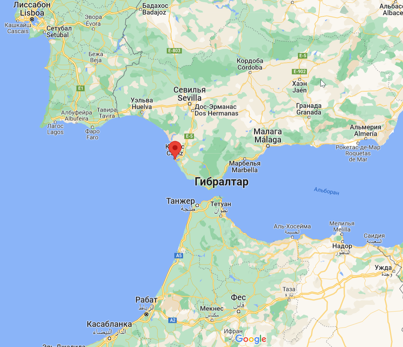 Город Кадис - это крайняя юго-западная точка Испании. Ниже нее - только Африка, левее - Америка.