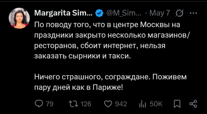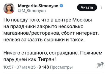 В Москве и Подмосковье с 5 мая происходят сбои в работе мобильных операторов. 7 мая на фоне генеральной репетиции парада на Красной площади в столице стали с перебоями работать платежные системы, приложения банков, служб такси и доставок. О трудностях в работе в ближайшие дни клиентов предупредили Сбербанк и ВТБ, оператор Системы быстрых платежей (СБП), Lamoda и «ВкусВилл», а Мосгортранс рекомендовал пассажирам общественного транспорта пополнить карту «Тройка» до наступления праздничных дней. На фоне массированных атак украинских беспилотников интернет также начали «глушить» в десятках городов и населенных пунктов России. По данным Baza, речь идет по меньшей мере о 30 городах и поселках в Ярославской, Тверской, Московской, Нижегородской, Тульской, Ленинградской, Калужской и Курской областях. (Отсюда.)