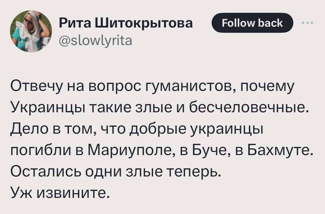 Сегодня решил, чтобы начали чем попало еб..шить по украинским городам без вообще прицела. микрорайоны, школы, детские сады - нам пох, терракт был, мстим, как умеем. В воспаленном мозгу кремлевских маразматиков это единственный способ нагнуть Украину.