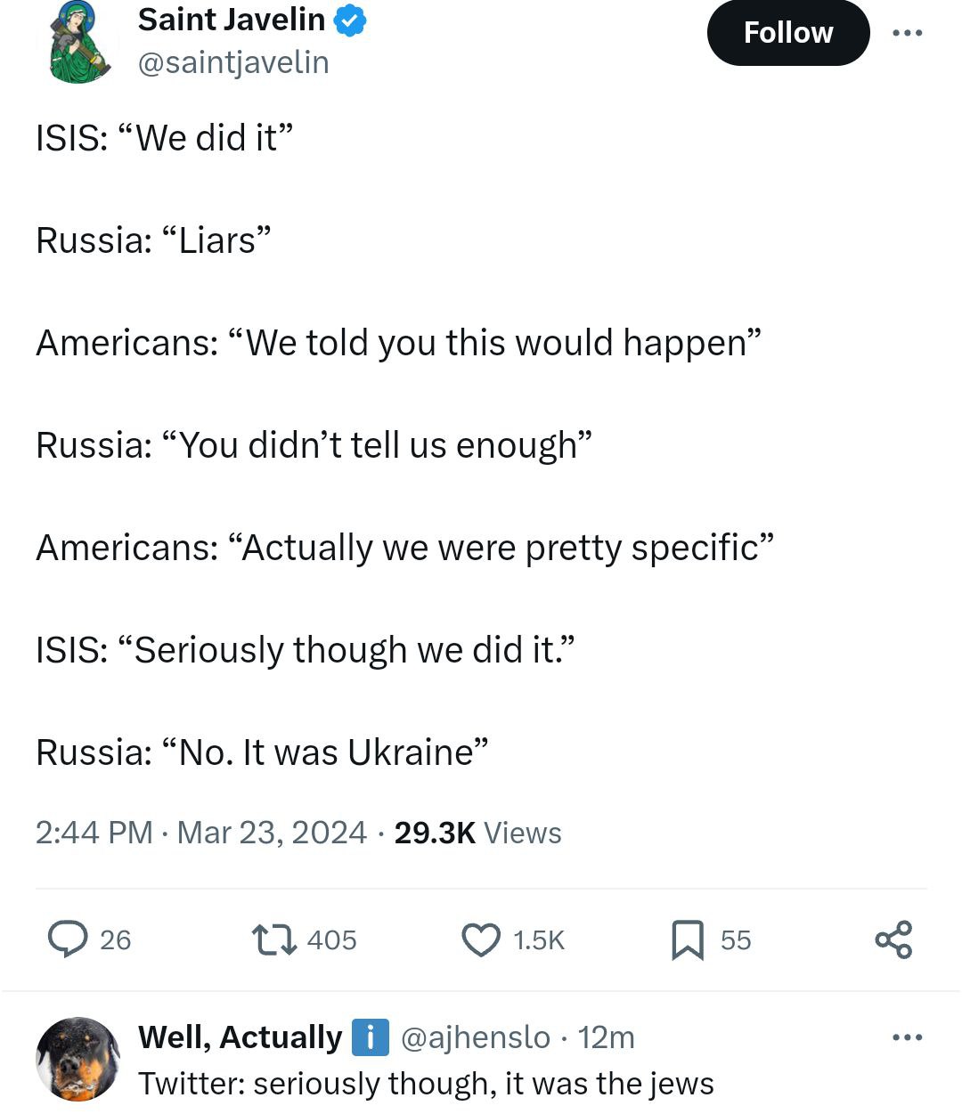 Тогда я стал ждать, что дело по горячим следам моментально раскроют, кого-нибудь задержат и, внезапно, обнаружат украинский след. Бравые ребята не подвели, все так и сделали. Дальше, видимо, науськивание народа против Украины (хотя куда дальше, казалось бы?), введение смертной казни и более плотное насаждение систем контроля и идентификации людей в общественных и не очень местах, естественно, ради их же блага и безопасности.