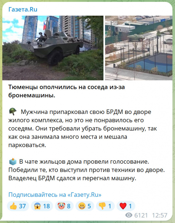 Сосед на бронемашине ополчился на тюменцев из-за газеты.ру. В чате жильцов дома соседи проголосовали против, поэтому владелец передавил их автомобили на парковке так как они много занимали во дворе. Это понравилось тюменцам на бронемашинах и они сдались БРДМ.