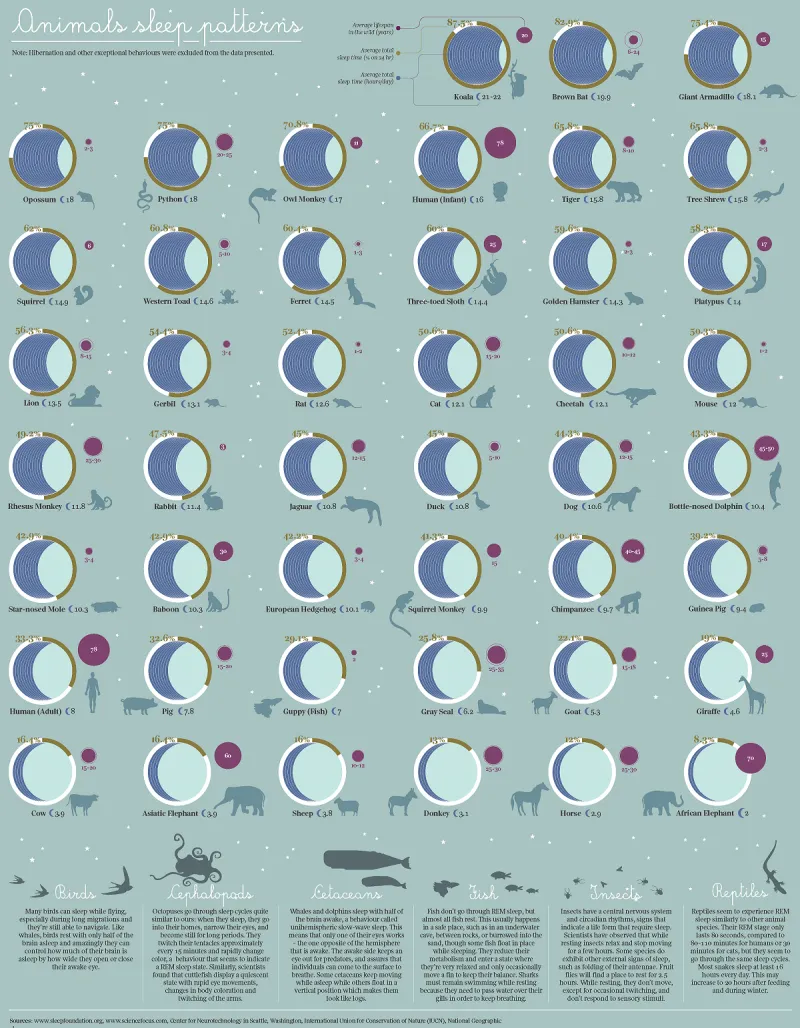Любопытная диаграмма, которая показывает, какие из животных сколько спят и какой процент дня проводят во сне. Основные чемпионы - коалы, которые спят 87,5% дня. Коты, кстати, всего-то спят 50,6% дня, так что клевещут на них. А самые малоспящие - лошади и слоны.