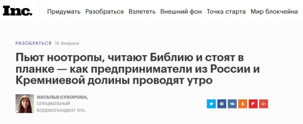В издании Inc. забавная статья о том, как различные предприниматели из России и Кремниевой долины проводят утро. Интересно было почитать и сравнить.