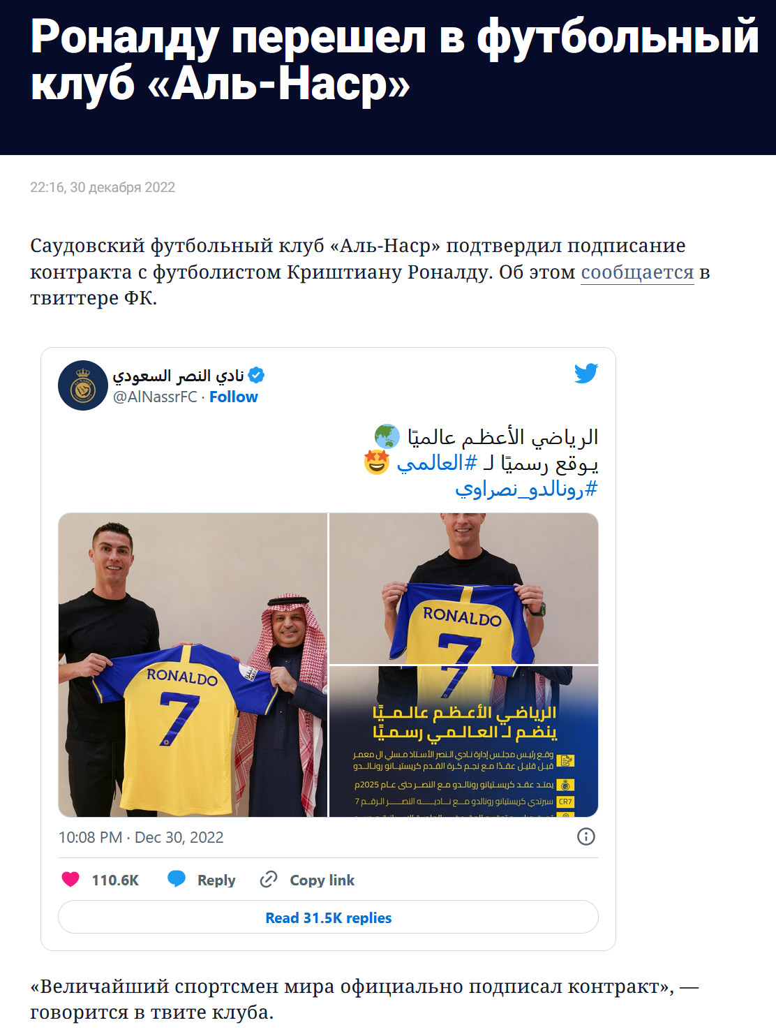 Величайший футболист мира (без дураков) до "Аль-Насра" доигрался. Я слегка в шоке. Кто что думает по этому поводу? Нет, ну да - получит 200 хулиардов в год и новую "Ламборгини" каждый день - за саудитами не заржавеет. Но тем не менее.