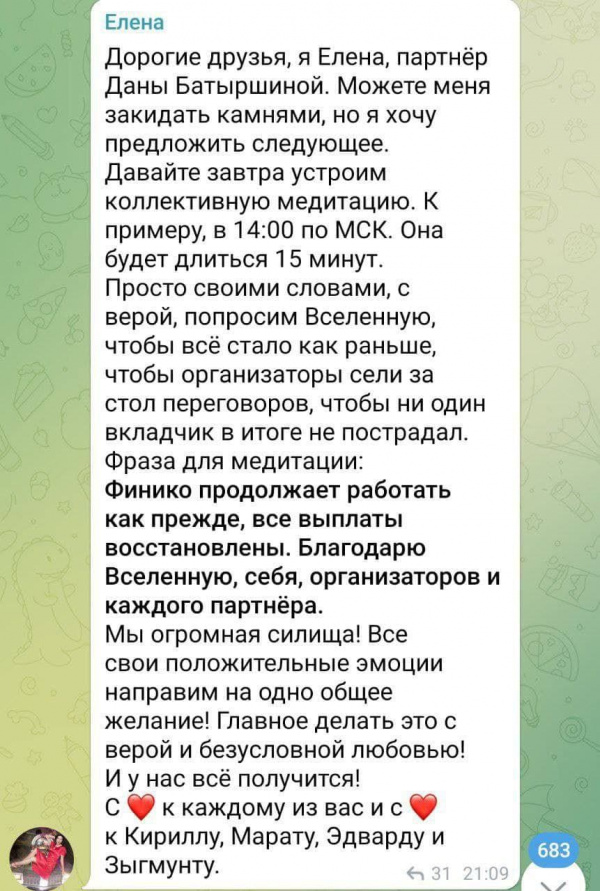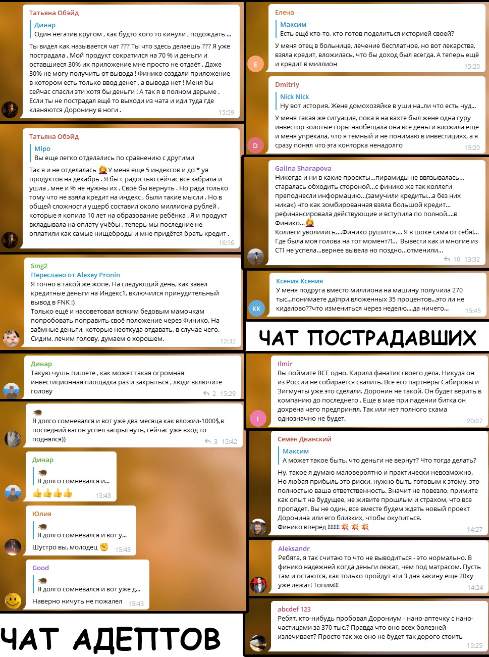 В России грохнулась очередная пирамида под названием "Финико" - вот тут всякие подробности. Ну, грохнулась и грохнулась, дело такое. Но я тут наткнулся на скрины переписки людей, принесших этому жулью свои (и не только свои, как выяснилось) деньги. Слушайте, но это прям реально страшно, это же законченная клиника. Большинство этих людей нужно запирать в палаты для буйнопомешанных. Они опасны и для общества, и для самих себя. Ужас какой-то.