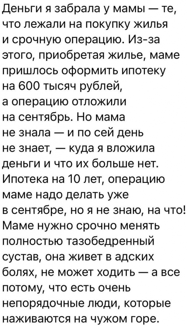 Вот это выше - особенная жесть. Непорядочные люди, которые наживаются на чужом горе - это понятно. Но эта-то идиотка о чем думала, когда лишала собственную мать денег на операцию, чтобы на дурика срубить бабла?