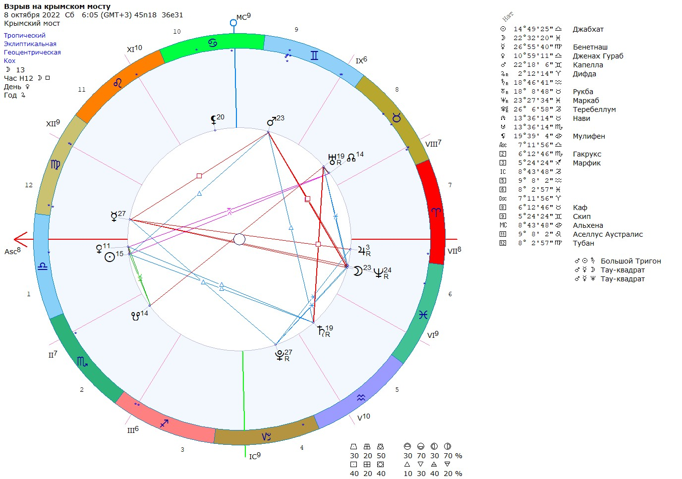 Текущая точная квадратура Уран-Сатурн (Водолей-Телец) попадает в 8 и 5 дома, Уран тут управитель 5д. в 8 доме. Трактовка аспекта. Игра в опасность, демонстрация опасности, показушная опасность и угроза. Использование напряженности между Украиной и россией в своей опасной игре. Назначенная дестабилизирующая роль Украине. Логика следующая - украинская власть заявляла что нанесет удар по Крымскому мосту, так давайте это обыграем, и воспользуемся ситуацией.