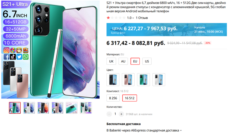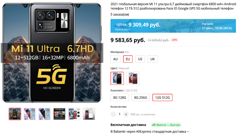 В Aliexpress обнаруживается немало предложений вот такого типа. Понятно, что это не Xiaomi Mi 11 Ultra, который стоит на порядок дороже. Это просто Mi 11 Ultra. С экраном HD, как там честно написано. Понятно, что это убогая подделка с фейковыми камерами. Но там четко указано количество памяти, а никаких 12/512 ГБ там за такие деньги по определению не может быть. А в чем тогда вообще смысл? Ну, купит кто-то это сдуру. Ну так всегда же оспорить можно и деньги вернуть, так как товар не соответствует заявленным характеристикам.