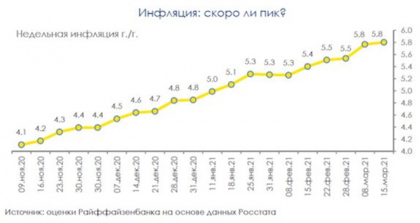 В России прогрессирует инфляция. Центробанк обещал удерживать ее в рамках 4%, А тут с ноября прошлого года никакими четырьмя процентами уже не пахнет, уже почти 6%.