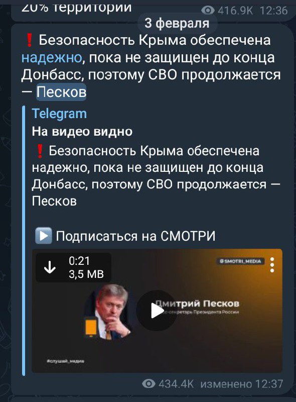 Дмитрий Песков 3 февраля: СВО продолжается чтобы обезопасить Донбасс
