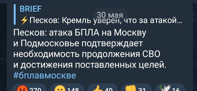 «Это ответные действия киевского режима на наши эффективные удары». Песков — об атаке беспилотников на Москву и Подмосковье