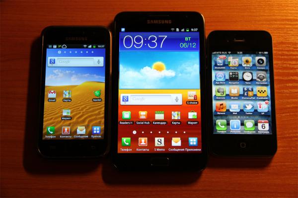 Вот он, Galaxy Note, в окружении iPhone 4 и Samsung Galaxy S.