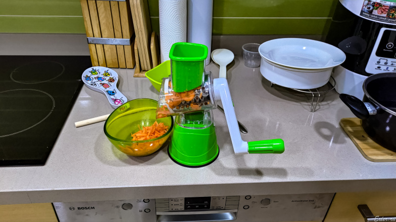 Морковь добавляю - одну среднюю морковку на половинку большого кочана. Натираю ее на вот этой очень удобной терке, которую купил полтора года назад, причем когда о ней написал, мне сказали, что она проживет не больше месяца. Ничего, полтора года прекрасно прожила, а использую я ее нередко.