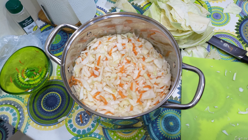 Капусту при укладывании в емкость как следует мну руками, чтобы она пустила сок, и перемешиваю ее с морковкой, продолжая жамкать. В процессе подготовки ничего не добавляю.