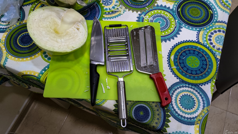 Шинковок у меня три штуки, включая Börner V5, но на ней капусту шинковать - долго и нудно (и слегка опасно), та, которая в центре (китайская с Aliexpress), хорошо и удобно шинкует для капустного салата, но для заквашивания - тонковато, а та, которая справа, и не такая удобная, и тоже слишком мелко шинует, мне нужно крупнее. Поэтому шинкую большим, остро отточенным ножом - получается именно так, как надо.