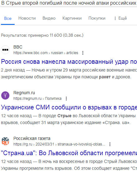 Если искать "В Стрые", то три первых результата - BBC, Regnum, Российская газета: