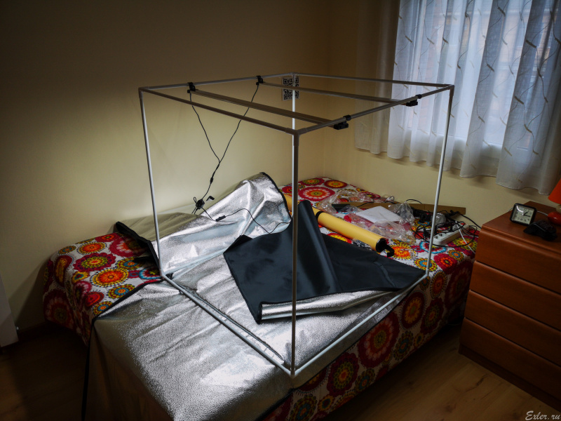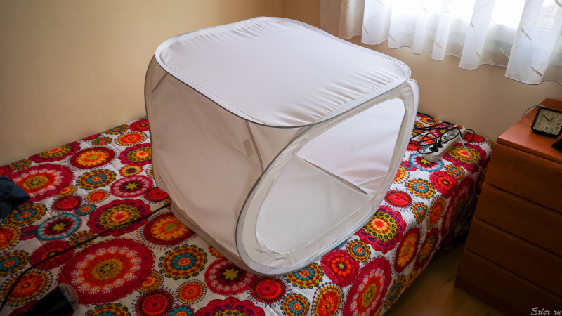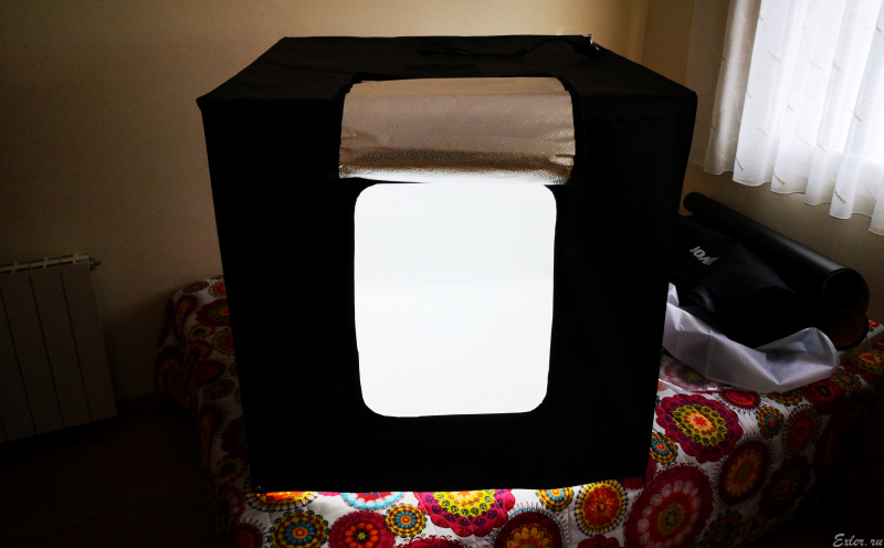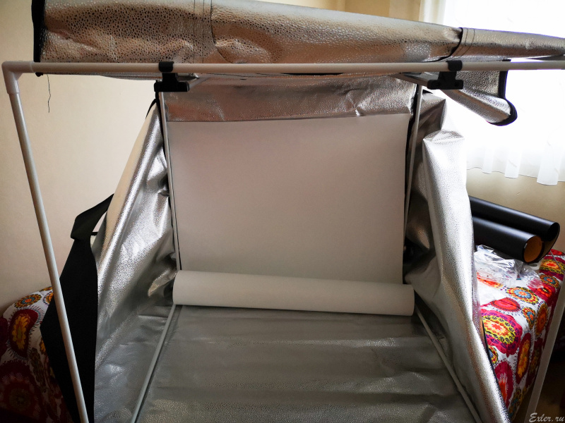 Я покупал у китайцев очень похожий. Бокс хороший, я покупал с четырьмя регулируемыми лампами. Пришлось колхозить внутри еще короб из матового акрила, чтобы в хромированных частях не отражалась структура отражающего материала. Кстати, сам фон у меня рассыпался через 2 года. При том что хранился он все время свернутым. Просто стал крошиться.