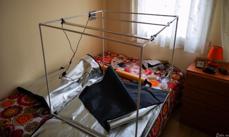 Продолжительное время для фотографирования предметки я использовал вот такой лайтбокс с двумя лампами-вспышками. Лампы поджигаются специальным инфракрасным пускачом, который ставится в фотоаппарат на место вспышки. (Или вместо этого -  вспышка с красным фильтром.)