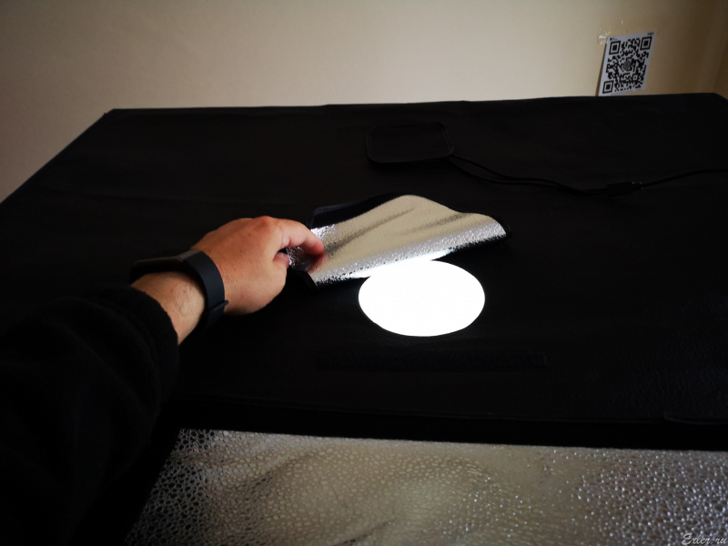 Но со смартфонами пришлось повозиться - бликуют страшно. Потом дошло: освещение нужно просто направить наверх, тогда бликов не будет. Внутри же материал светоотражающий.