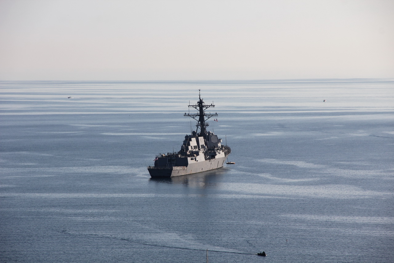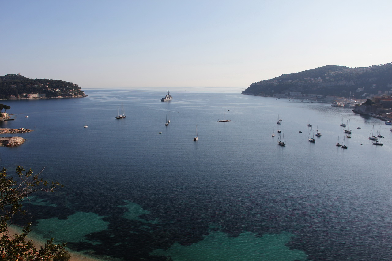 В бухте стоят яхты и небольшой военный корабль - охраняет миллионеров.