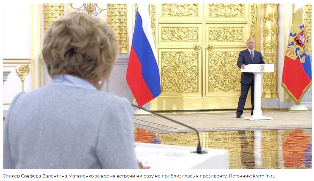 Со всеми остальными президент общается либо по видеосвязи, либо на очень большом расстоянии. Например, 23 сентября сенаторы, включая спикера Совета федерации Валентину Матвиенко, на встрече с главой государства не приближались к нему, слушая речь Путина на почтительной дистанции.