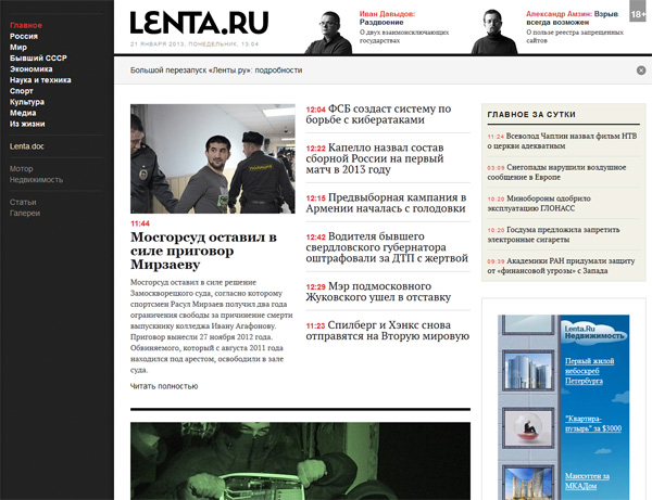 Френд-лента полна стенаний по поводу того, какой же это кошмар - новый дизайн Lenta.ru. Зашел посмотреть. Мне как раз старый дизайн конкретно очень и очень не нравился, особенно первый. Но я постоянно заходил за новостями, потому что считаю "Ленту" лучшим новостным изданием в "Рунете".