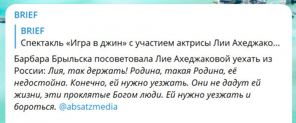 Барбара Брыльска, услышав об этом, посоветовала Лие уезжать из этого озверевшего путинского Мордорстана.